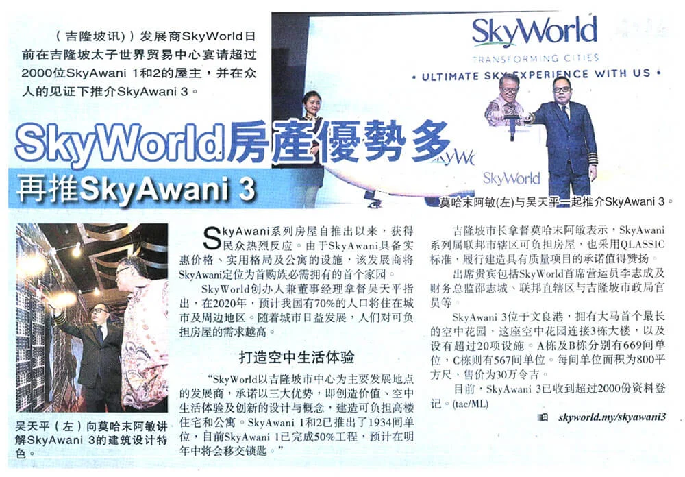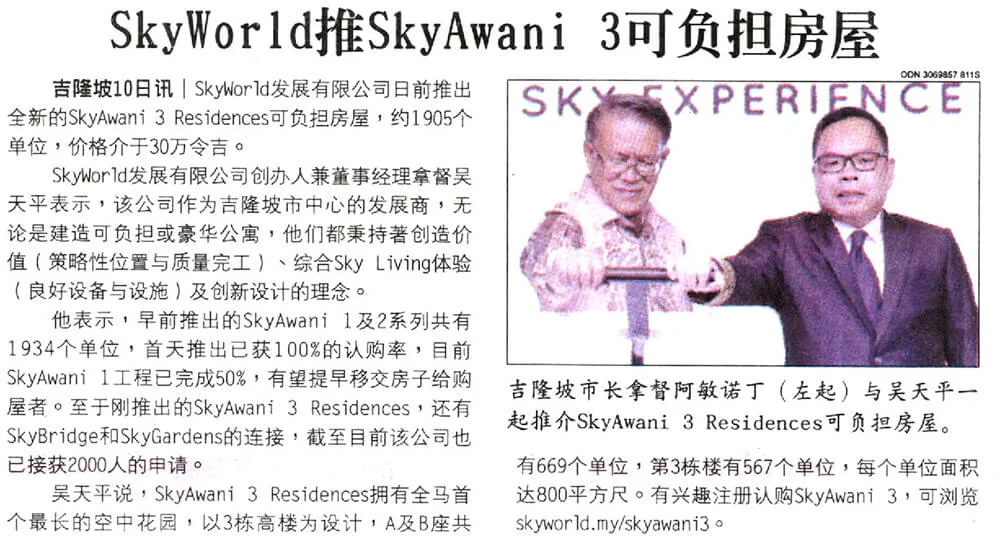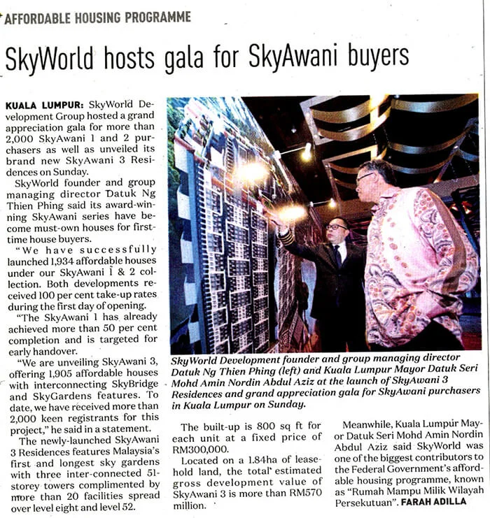 Also present to witness the launch ceremony of SkyAwani appreciation gala and SkyAwani 3 Residences were senior executive directors and officers from Kuala Lumpur City Hall (“DBKL”) and Ministry of Federal Territories (“KWP”) as well as SkyWorld senior executives, Mr Lam Soo Keong, Deputy Group MD, Mr Lee Chee Seng, COO and Mr Siew Chee Seng, CFO.