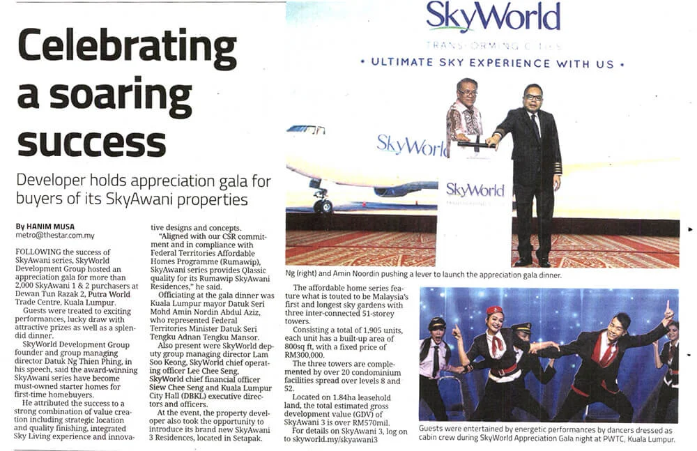To commemorate the success of the award winning SkyAwani homes, SkyWorld hosted a grand appreciation gala on 23 July 2017 at PWTC for more than 2,000 SkyAwani 1 & 2 purchasers. Present to grace and officiate the momentous event on behalf Minister of Federal Territories, YB Datuk Seri Utama Tengku Adnan was YBhg Datuk Seri Mohd Amin Nordin Abdul Aziz, Mayor of Kuala Lumpur.