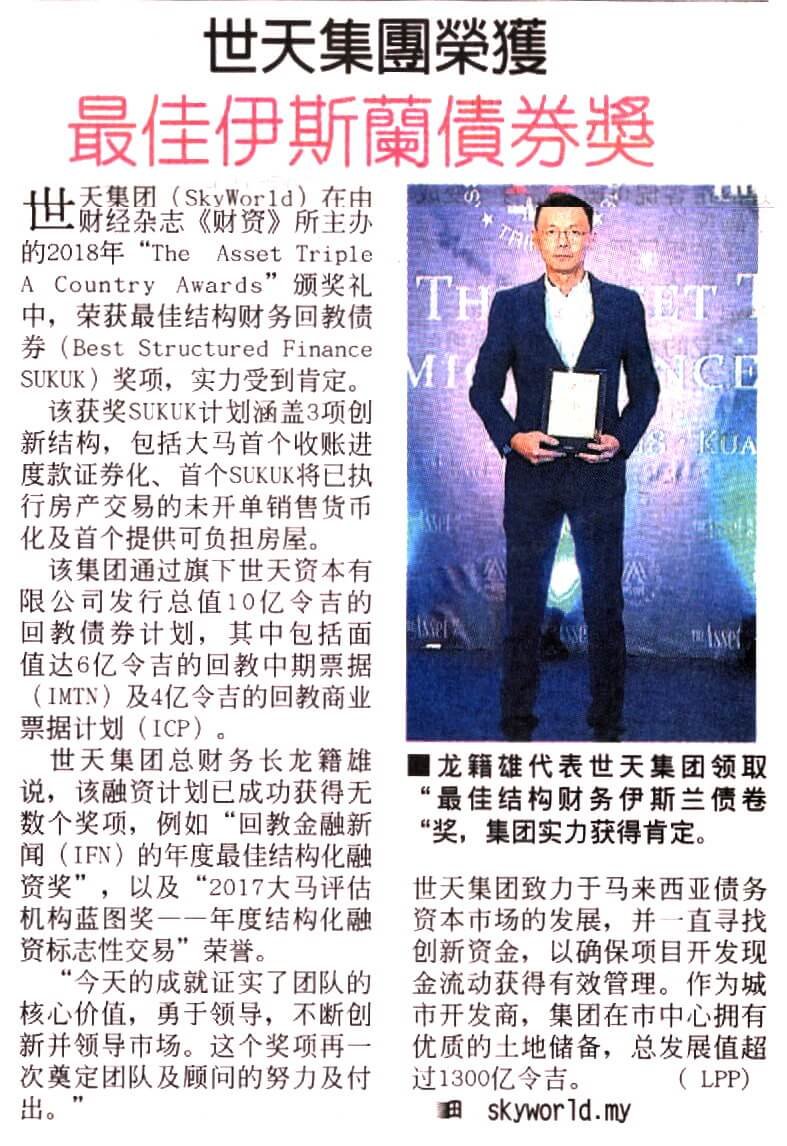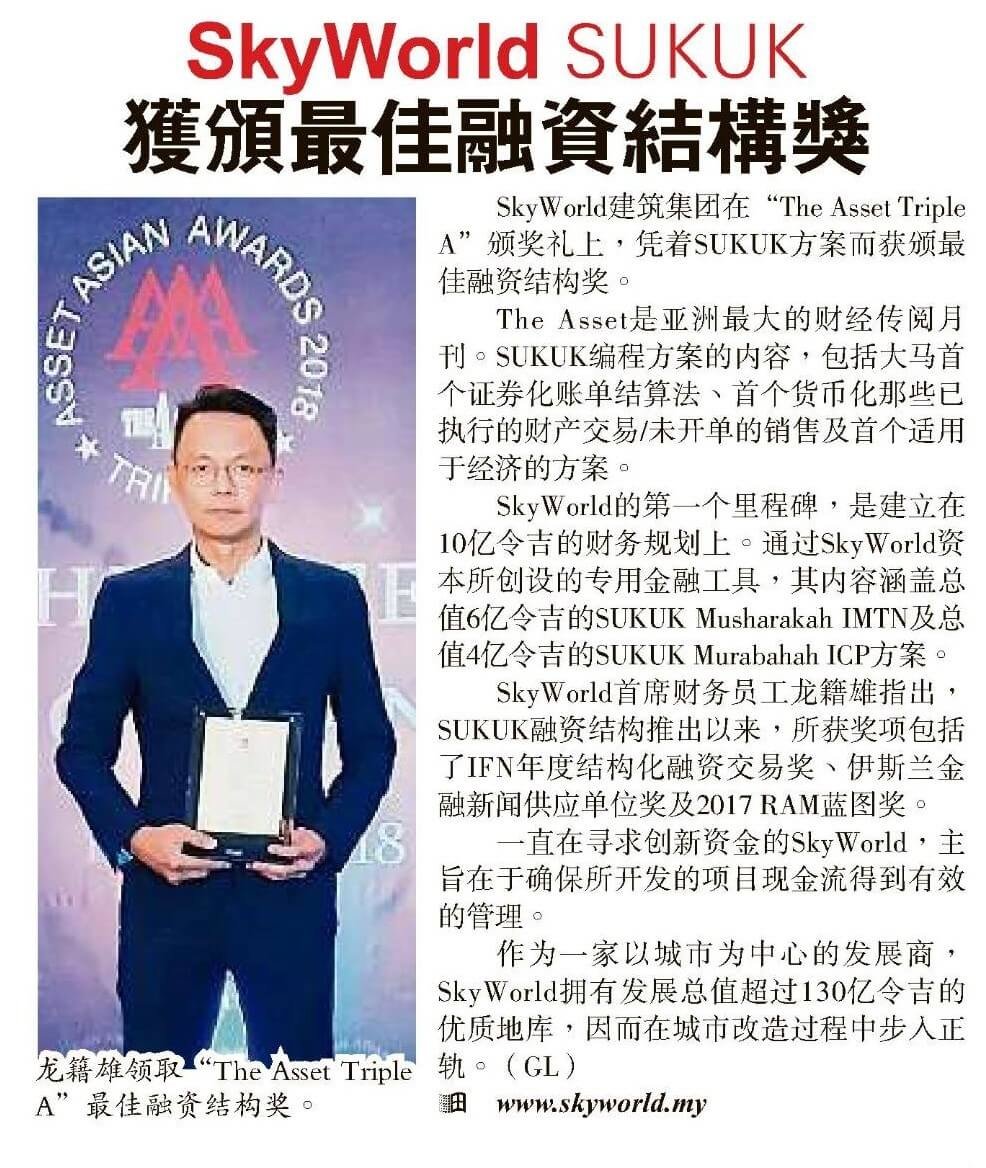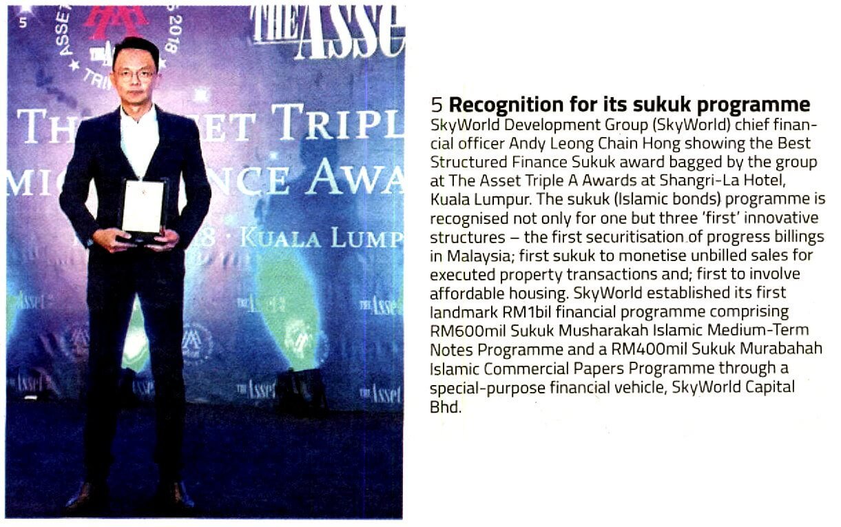 On 10 July 2018, SkyWorld Development Group was awarded the Best Structured Finance SUKUK at The Asset Triple A Awards ceremony held at Shangri-La Hotel, Kuala Lumpur. The Asset is Asia’s largest circulated financial monthly magazine. This SUKUK program is recognised not only for one but three ‘FIRST’ innovative structures –