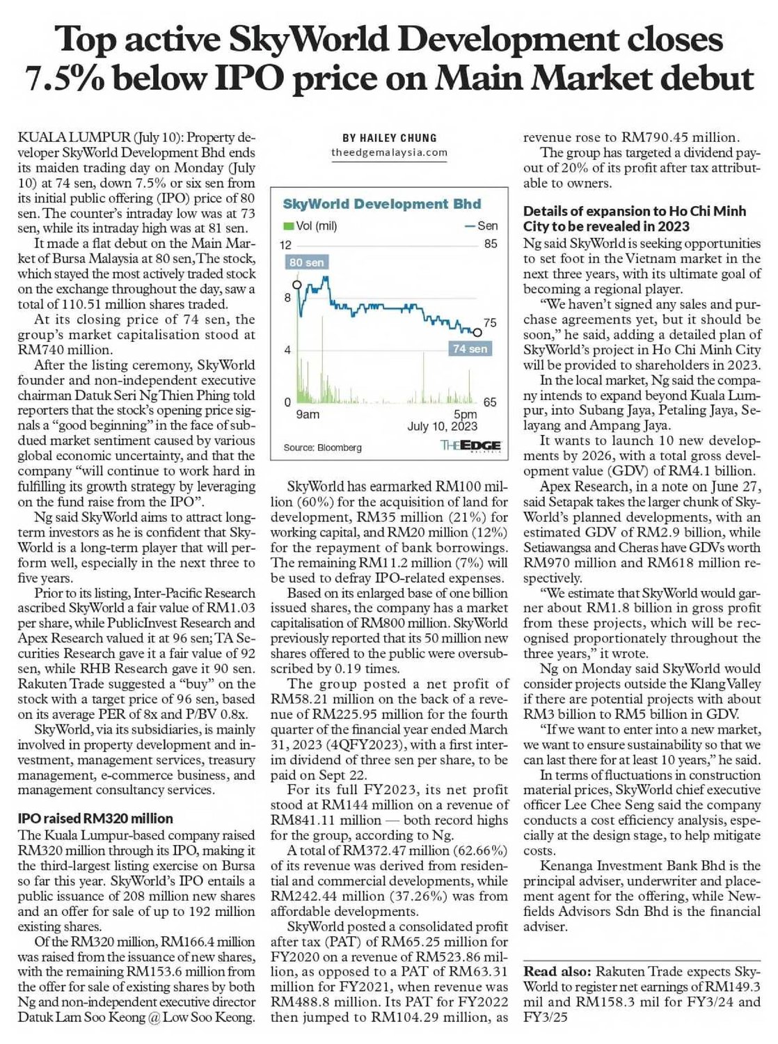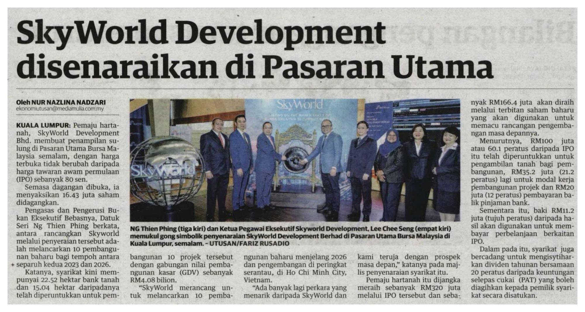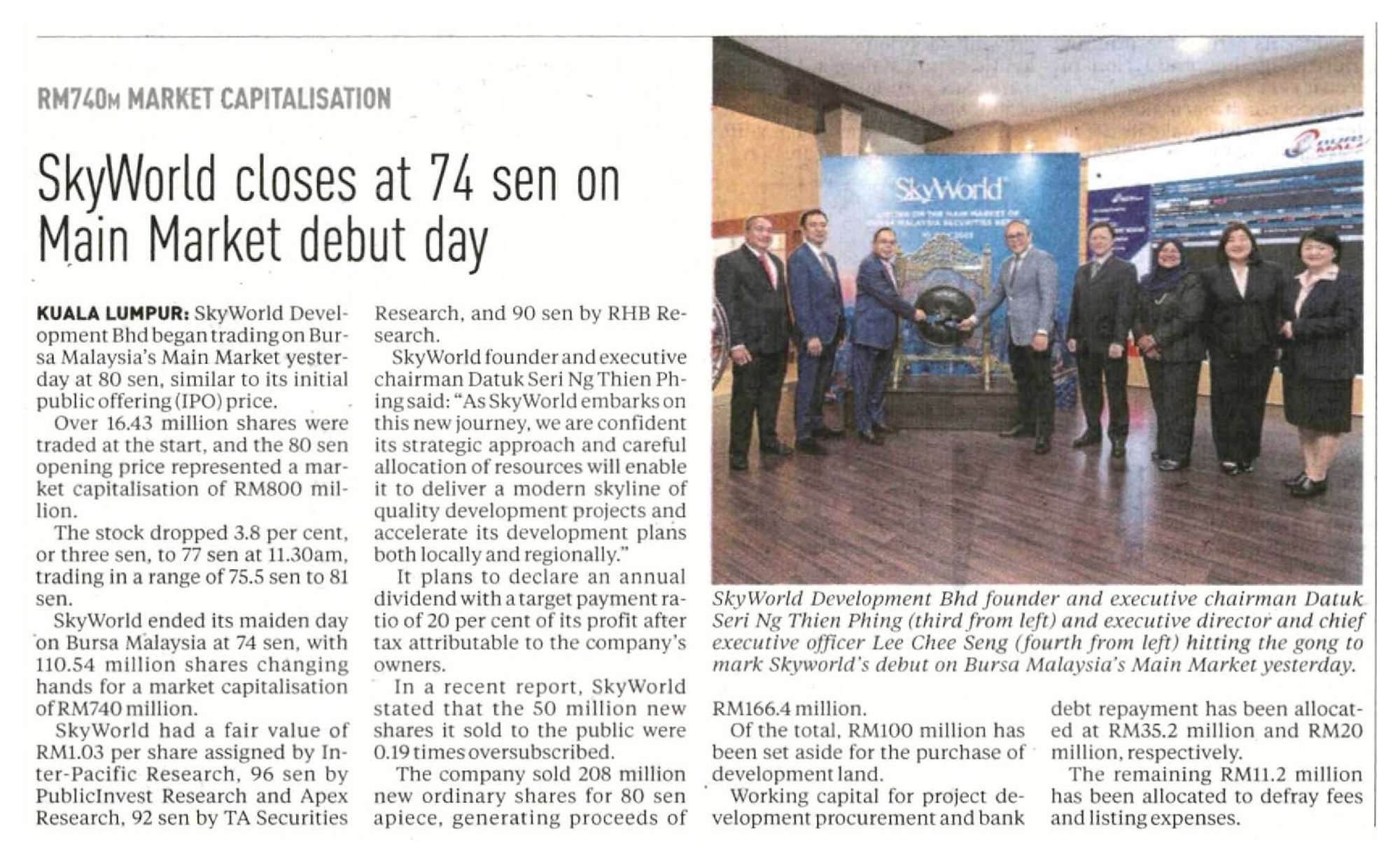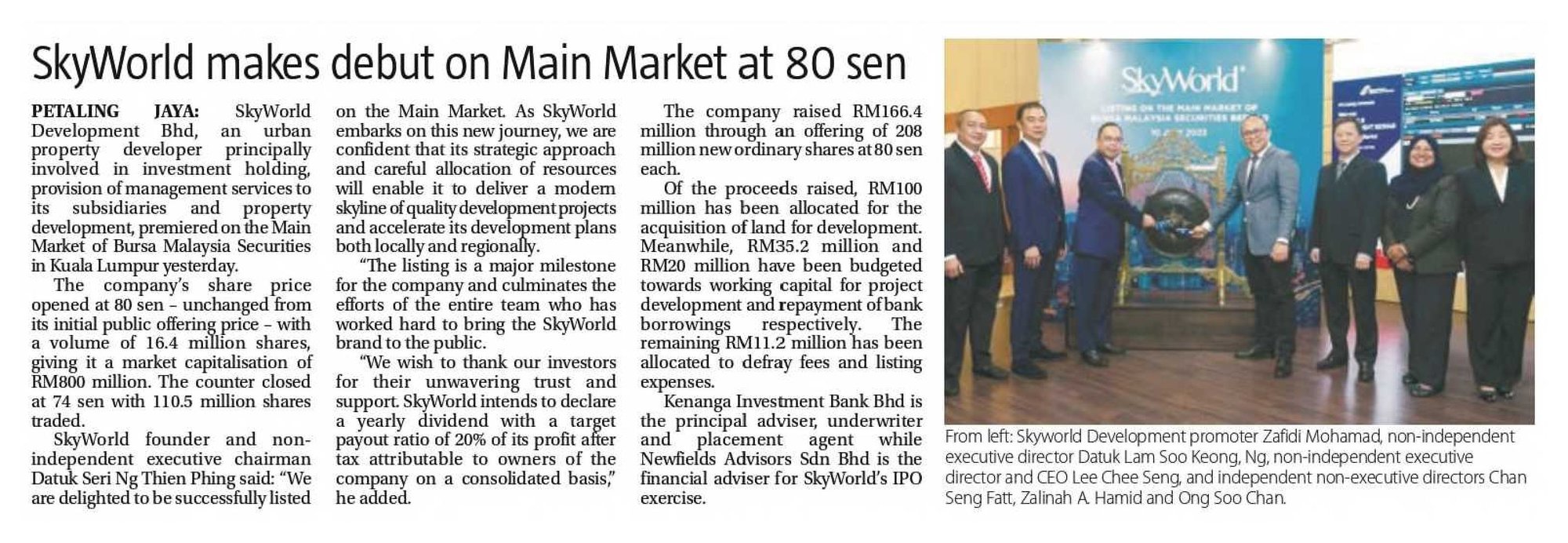 SkyWorld founder and non-independent executive chairman Datuk Seri Ng Thien Phing said, “We are delighted to be successfully listed on the Main Market. As SkyWorld embarks on this new journey, we are confident that its strategic approach and careful allocation of resources will enable it to deliver a modern skyline of quality development projects and accelerate its development plans both locally and regionally. The listing is a major milestone for the company and culminates the efforts of the entire team who has worked hard to bring the SkyWorld brand to the public.”