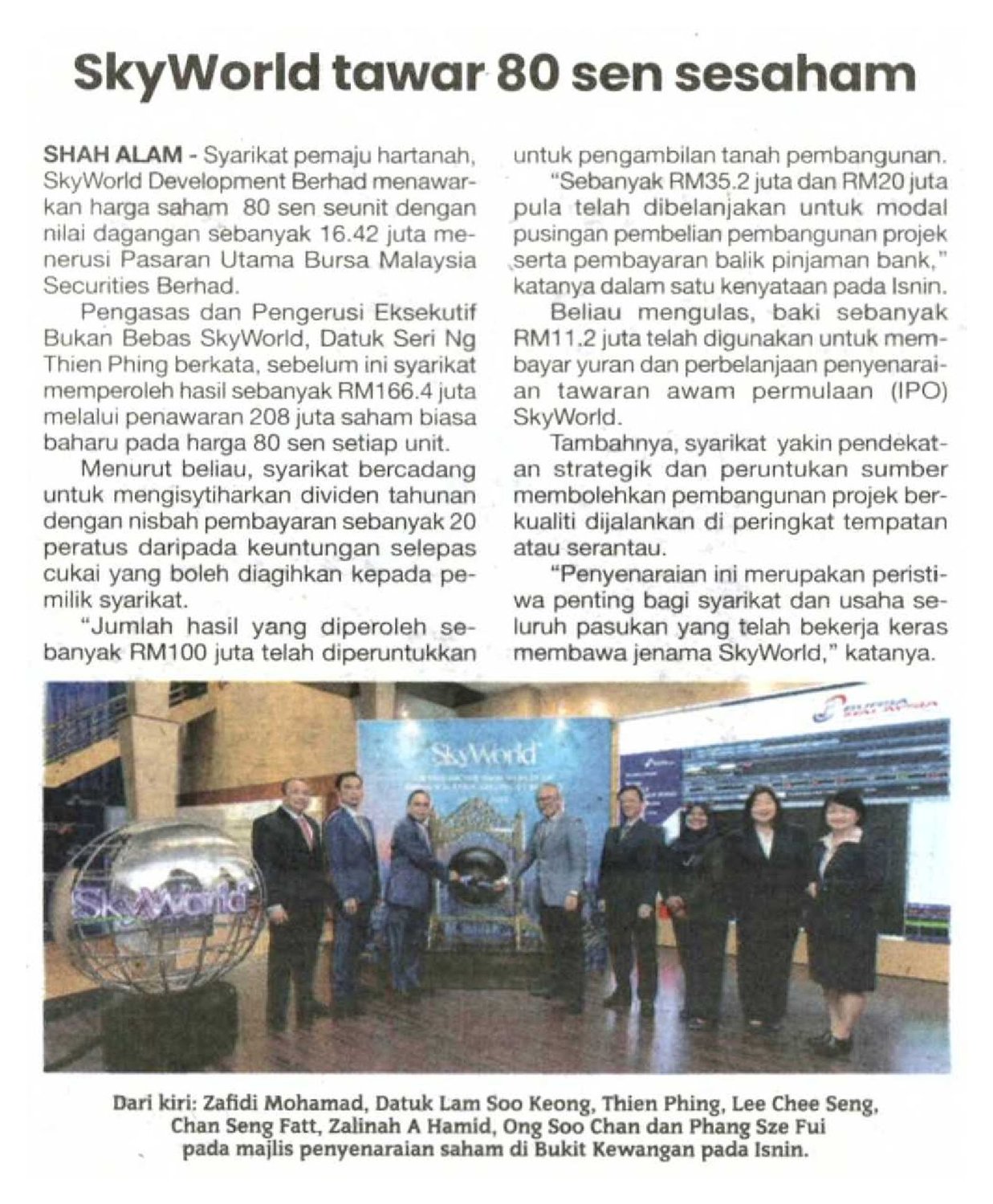 The Company successfully raised RM166.40 million in proceeds through an offering of 208,000,000 new ordinary shares at RM0.80 each. Of the total proceeds raised, RM100.0 million has been allocated for the acquisition of land for development. Meanwhile, RM35.2 million and RM20.0 million have been budgeted towards the working capital for project development purchase and repayment of bank borrowings respectively. The remaining RM11.2 million has been allocated to defray fees and listing expenses for SkyWorld’s IPO.