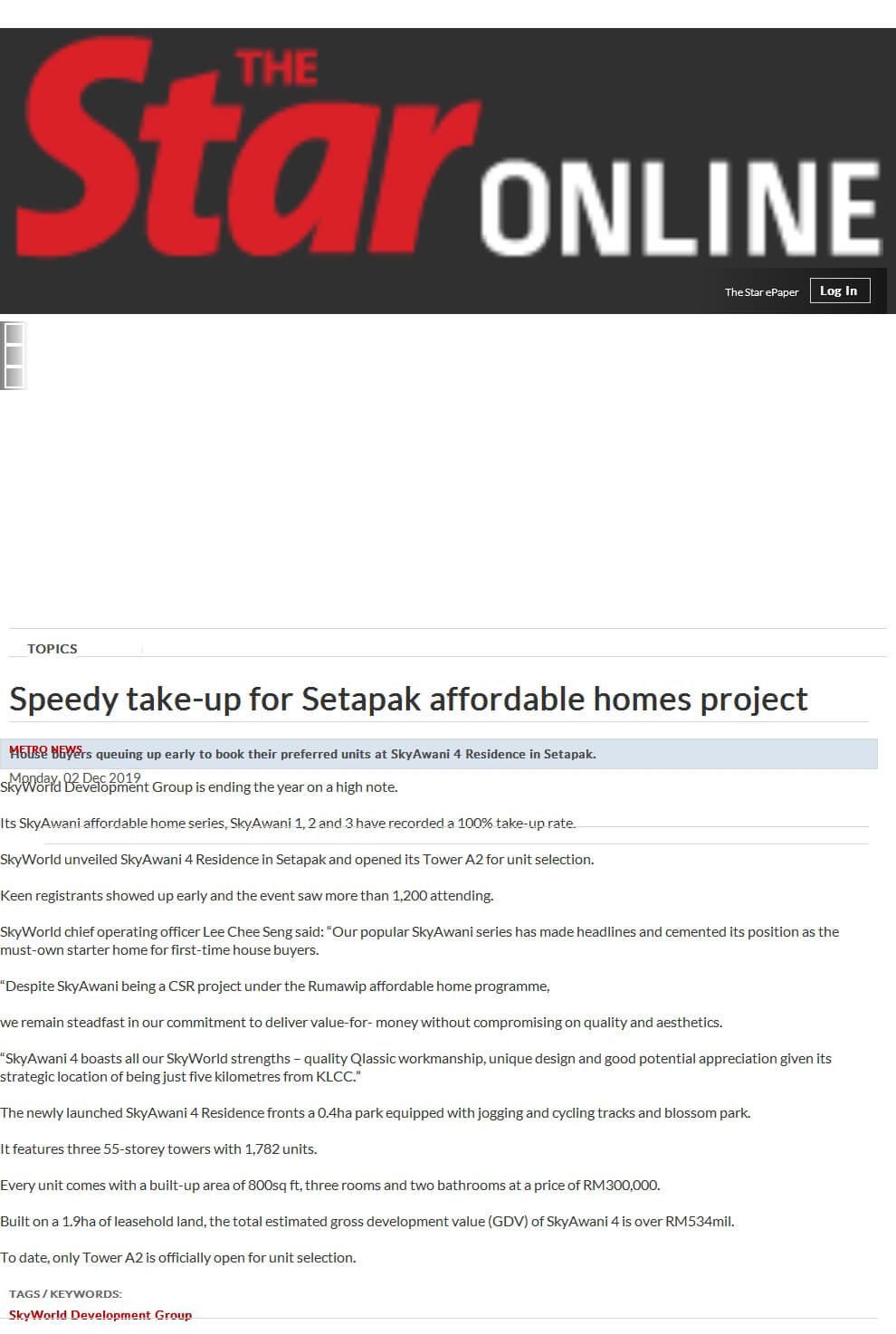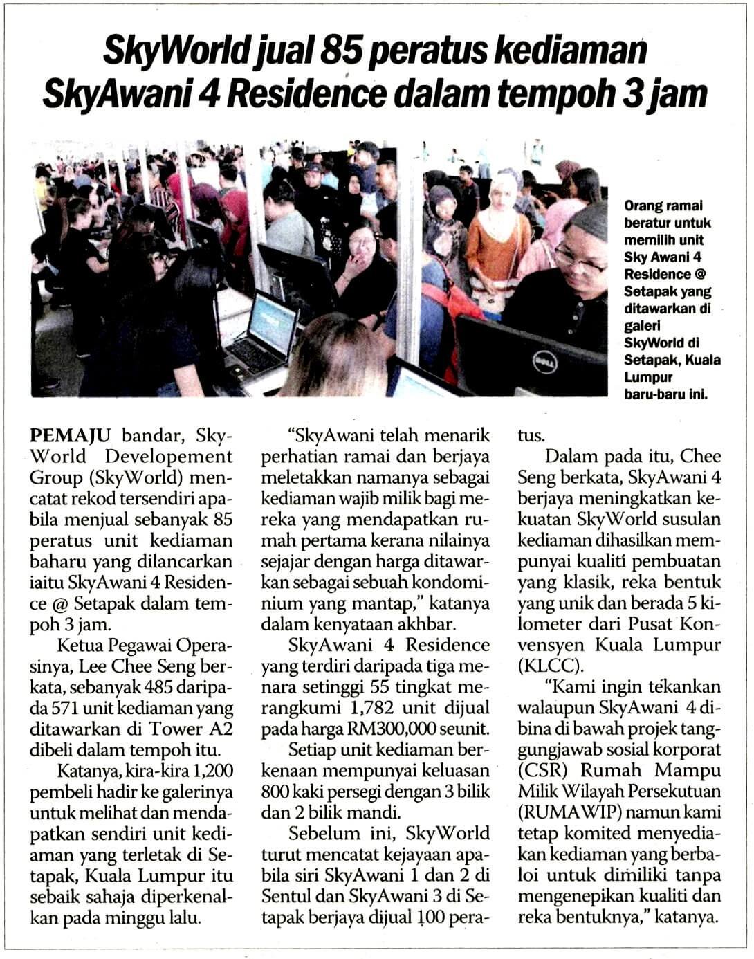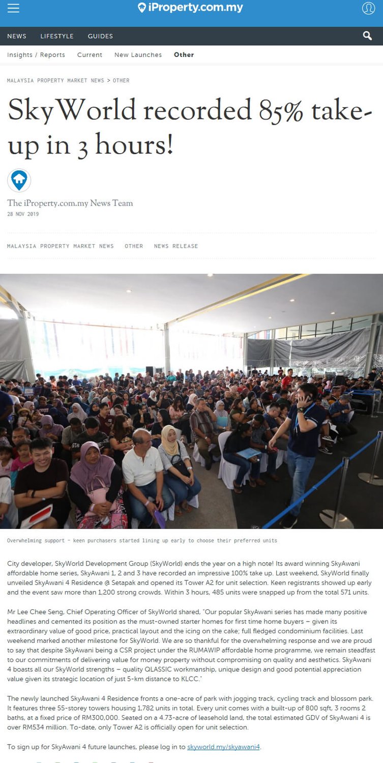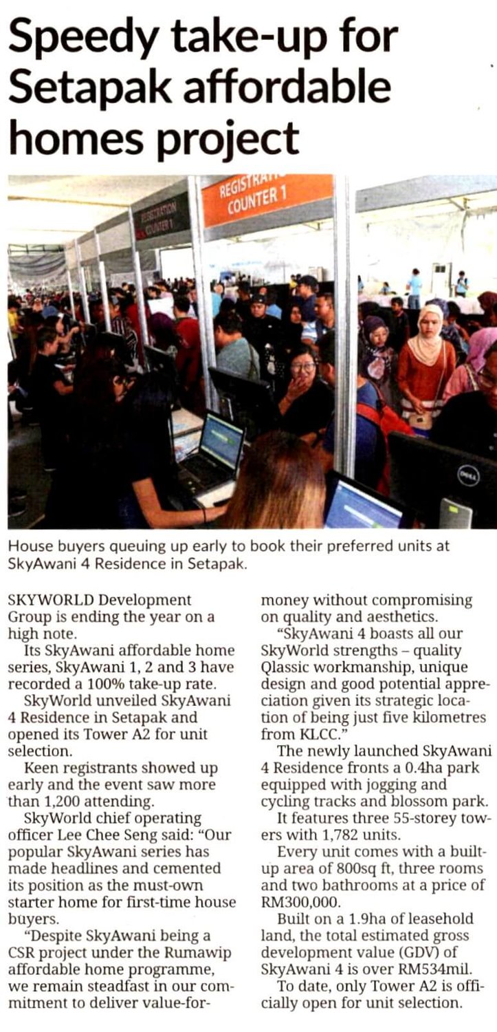 SkyWorld ends the year on a high note! Our award-winning SkyAwani affordable home series, SkyAwani 1, 2 and 3 have recorded an impressive 100% take-up. SkyWorld finally unveiled SkyAwani 4 Residences @ Setapak and opened its Tower A2 for unit selection. Keen registrants showed up early and the event saw more than 1,200 strong crowds. Within 3 hours, 485 units were snapped up from the total 571 units.