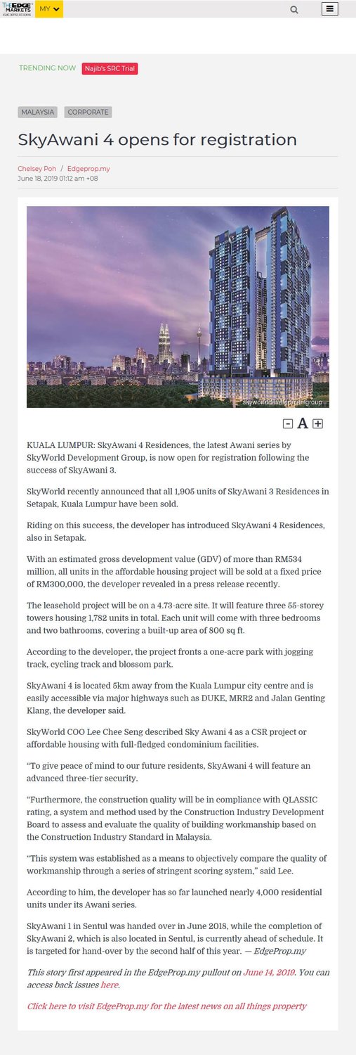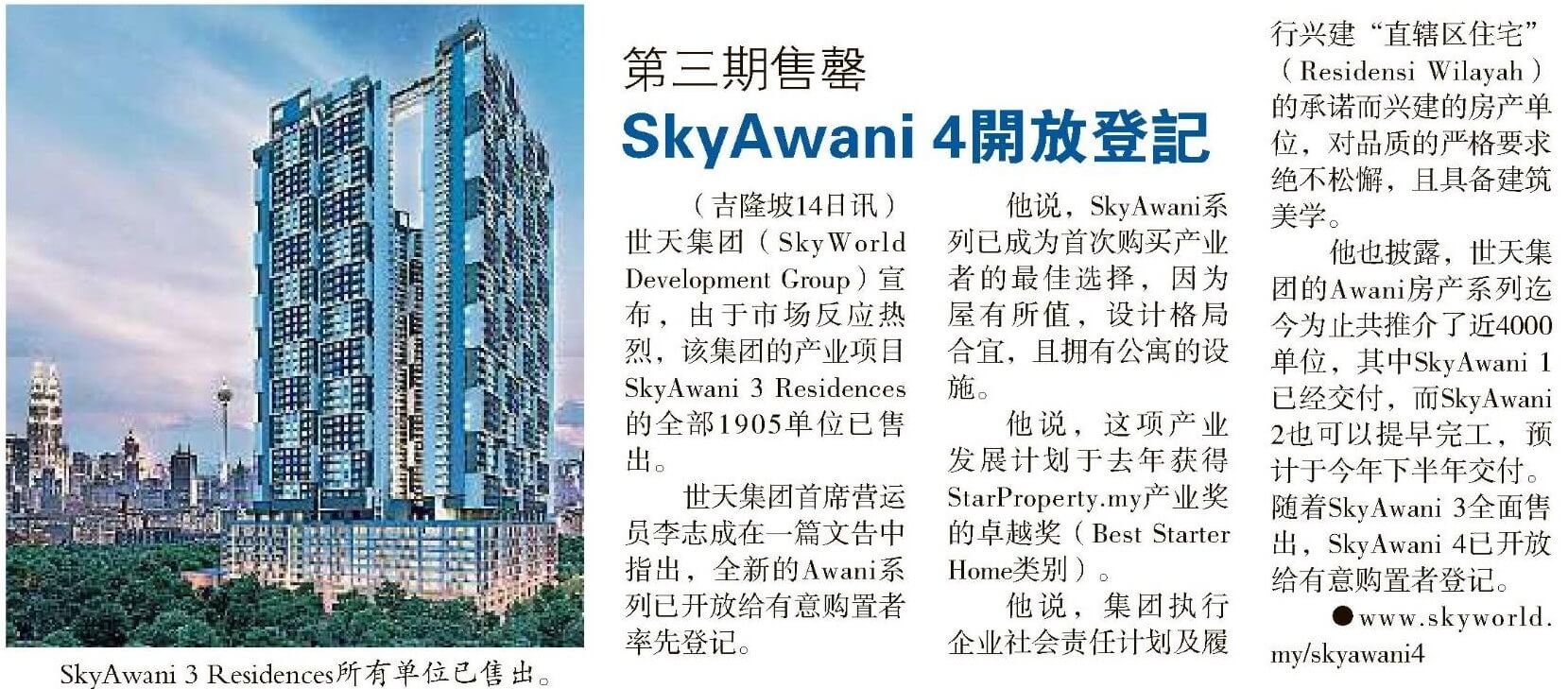 The newly launched SkyAwani 4 Residence fronts a one-acre of park with jogging track, cycling track and blossom park. It features three 55-storey towers housing 1,782 units in total. Every unit comes with a built-up of 800 sqft, 3 rooms 2 baths, at a fixed price of RM300,000. Seated on a 4.73-acre of leasehold land, the total estimated GDV of SkyAwani 4 is over RM534 million. To-date, only Tower A2 is officially open for unit selection. To sign up for SkyAwani 4 future launches, please log in to skyworld.my/skyawani4
