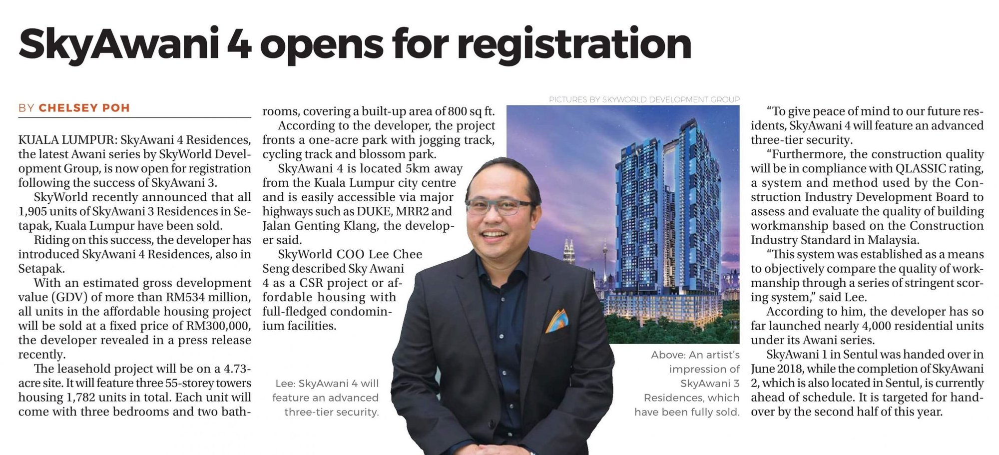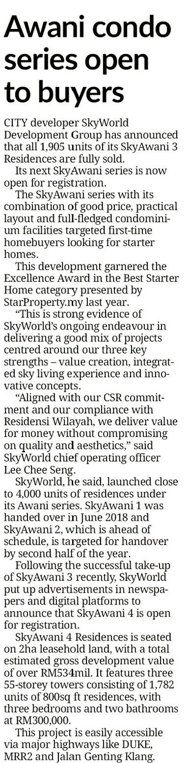 Mr Lee Chee Seng, Chief Operating Officer of SkyWorld shared, “Our popular SkyAwani series has made many positive headlines and cemented its position as the must-owned starter homes for first time home buyers – given its extraordinary value of good price, practical layout and the icing on the cake; full-fledged condominium facilities. Last weekend marked another milestone for SkyWorld. We are so thankful for the overwhelming response and we are proud to say that despite SkyAwani being a CSR project under the RUMAWIP affordable home programme, we remain steadfast to our commitments of delivering value for money property without compromising on quality and aesthetics. SkyAwani 4 boasts all our SkyWorld strengths – quality QLASSIC workmanship, unique design and good potential appreciation value given its strategic location of just 5-km distance to KLCC.”