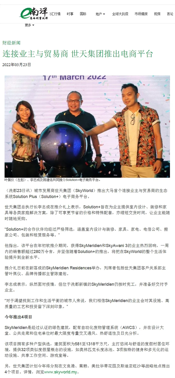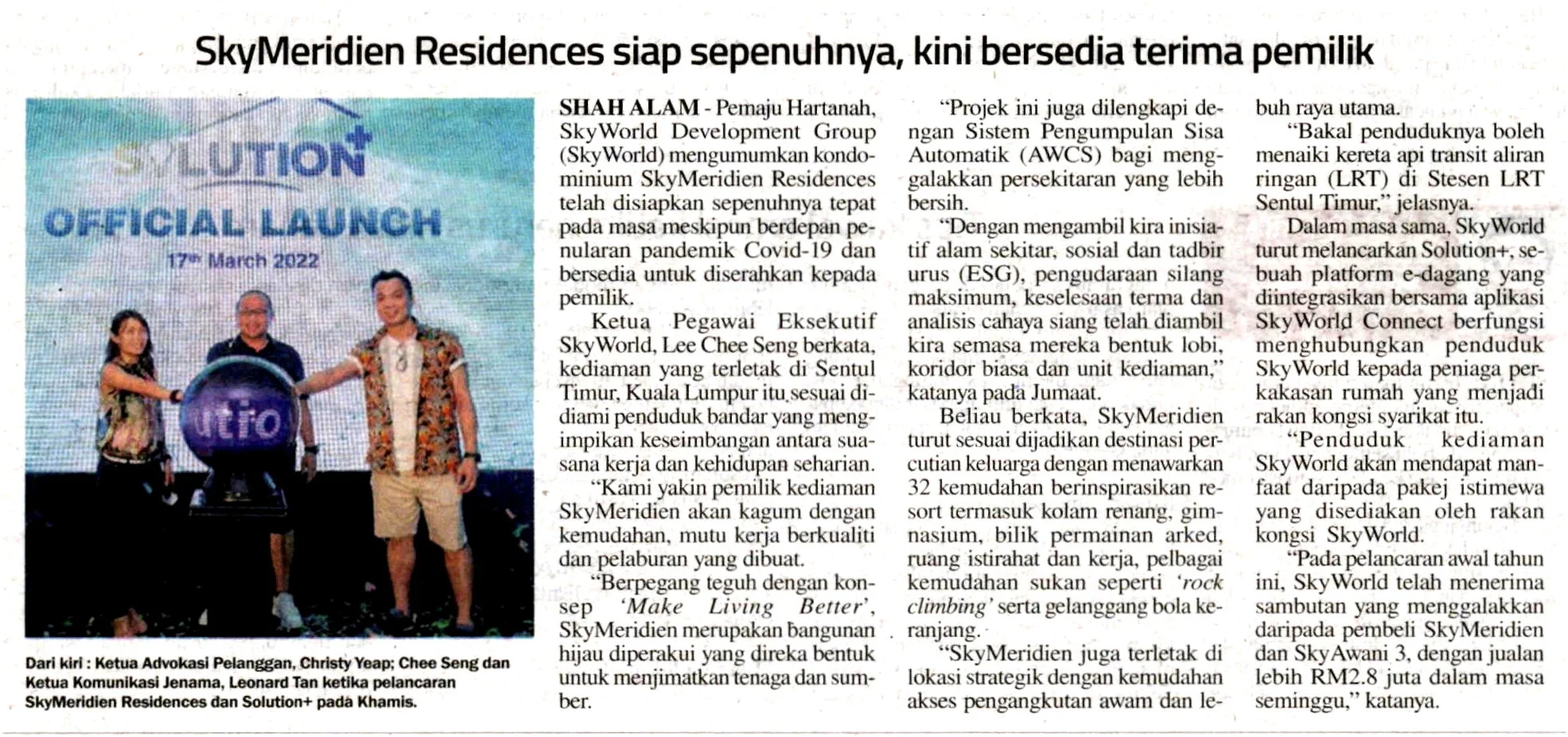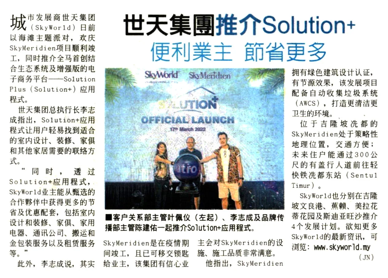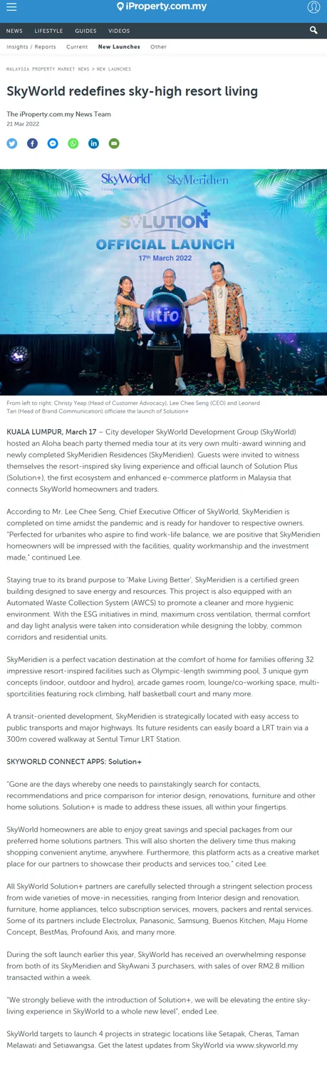 On 17 March 2022, City developer SkyWorld Development Group (SkyWorld) hosted an Aloha beach party themed media tour at its very own multi-award winning and newly completed SkyMeridien Residences (SkyMeridien). Guests were invited to witness themselves the resort- inspired sky living experience and official launch of Solution Plus (Solution+), the first ecosystem and enhanced e-commerce platform in Malaysia that connects SkyWorld homeowners and traders.