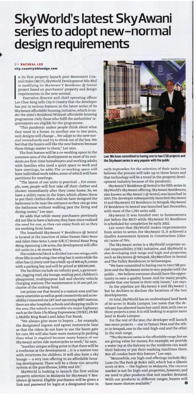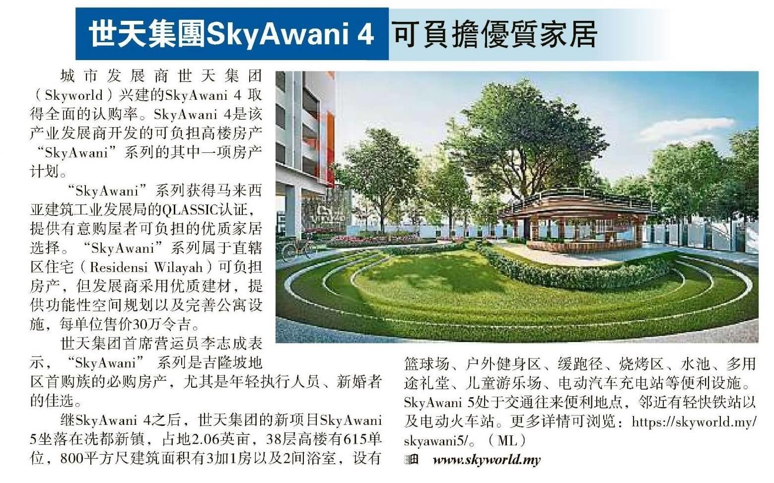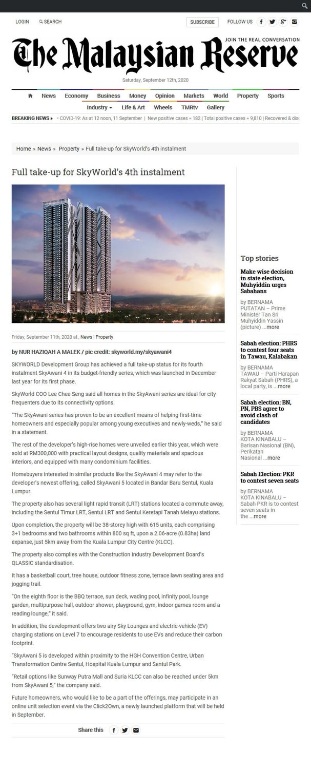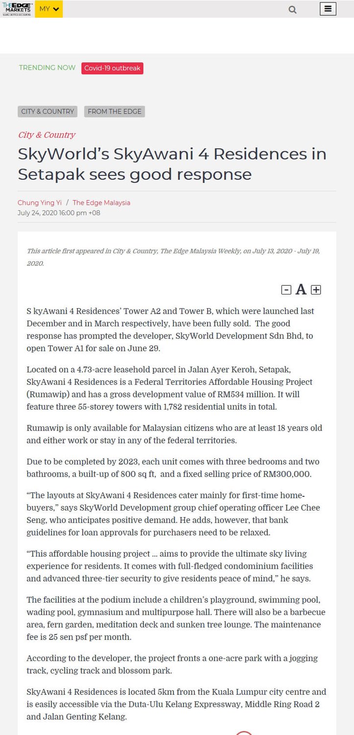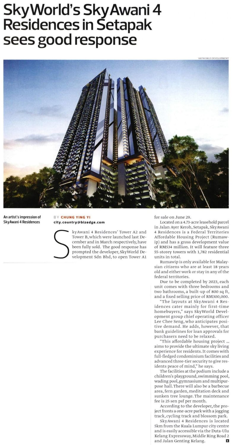 On 2 September 2020, SkyAwani 4 has now achieved a fully taken-up status. SkyWorld launched its first phase in December 2019 (Tower A2) while the remaining towers were unveiled to the members of the public early this year.