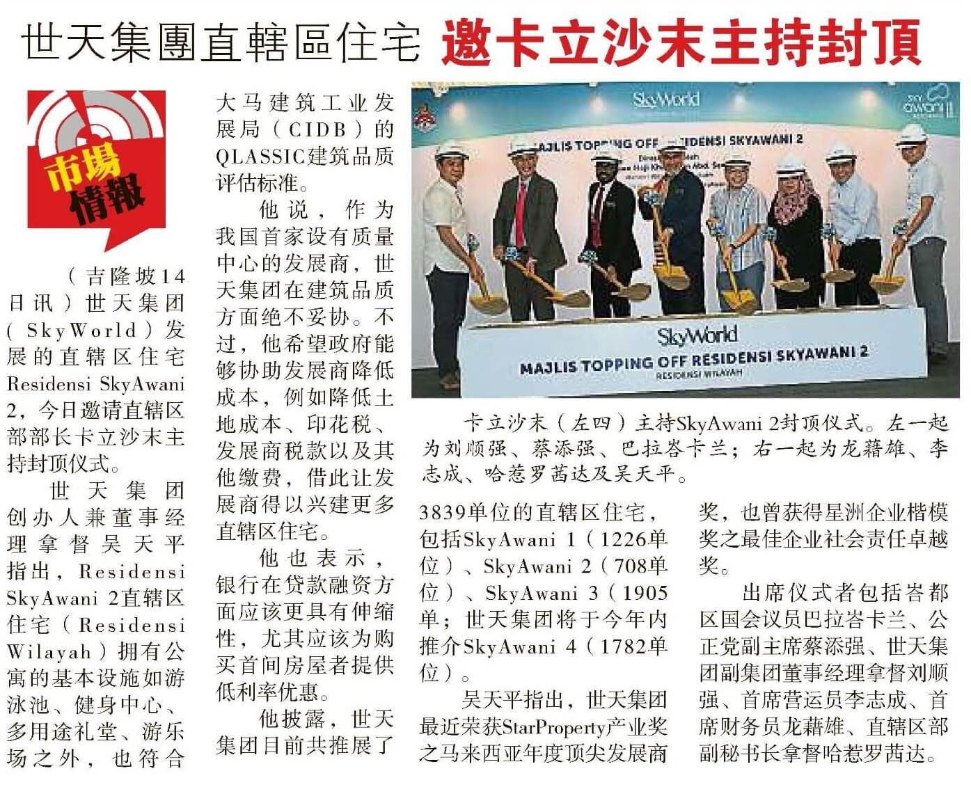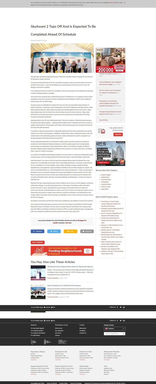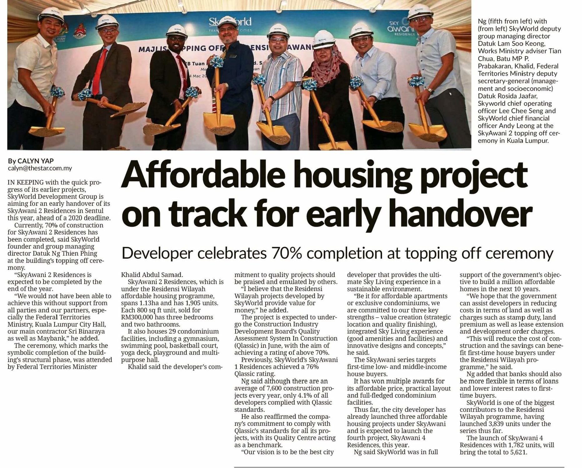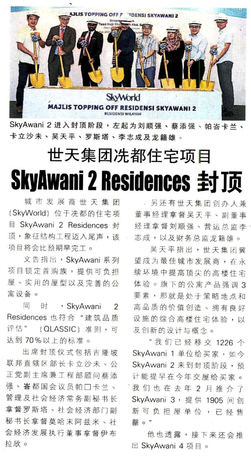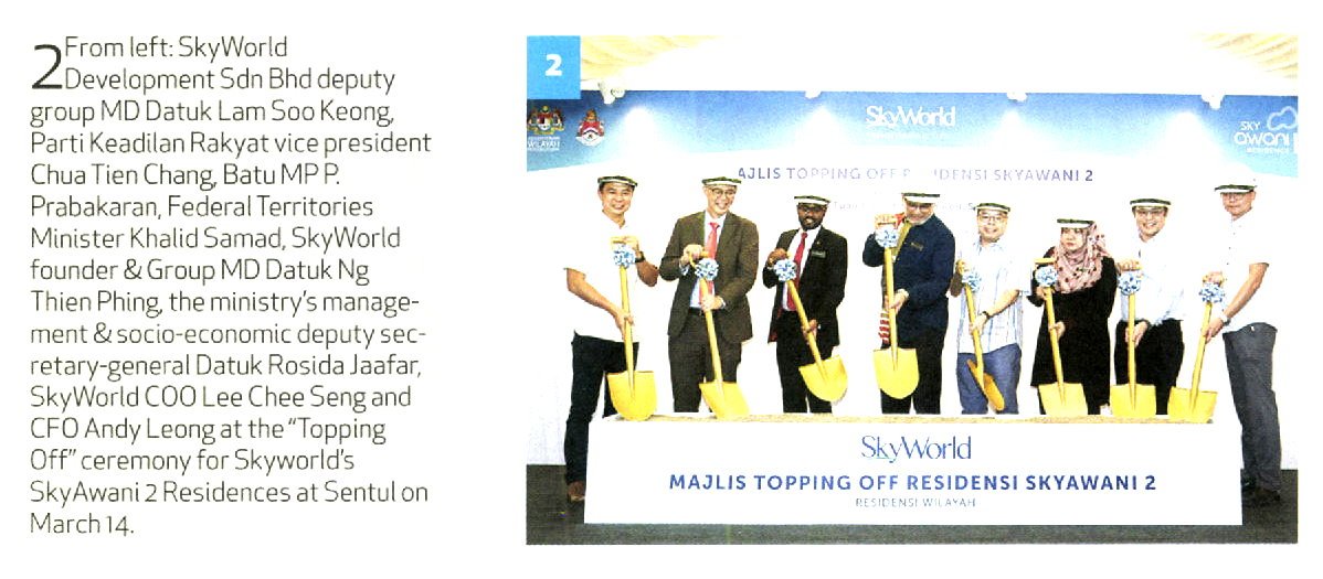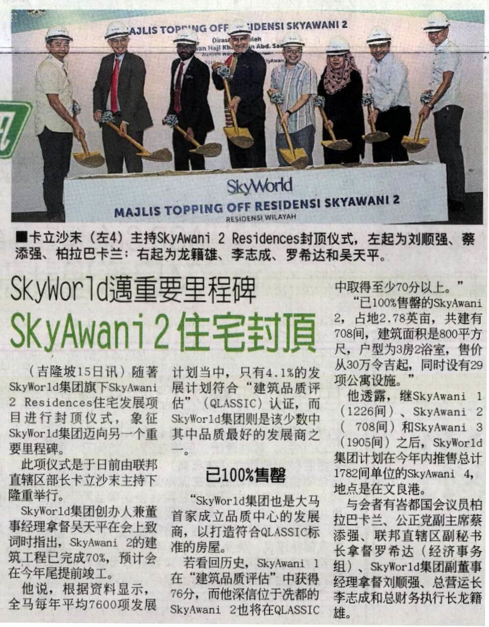 On 14 March 2019, SkyWorld celebrated another milestone today by hosting a successful SkyAwani 2 Topping Off ceremony at Sentul. The award-winning SkyAwani series has cemented its position as the must-owned starter homes for first-time home buyers – given its affordable price, practical layout and the icing on the cake; full-fledged condominium facilities. This Topping Off ceremony marks the symbolic completion of the structural phase of the building and SkyAwani 2 will be completed ahead of schedule. At the same time, SkyWorld also revealed that SkyAwani 2 Residences is in compliance with QLASSIC standards set by the Construction Industry Development Board Malaysia (“CIDB”) and is targeted to achieve above 70% QLASSIC rating.