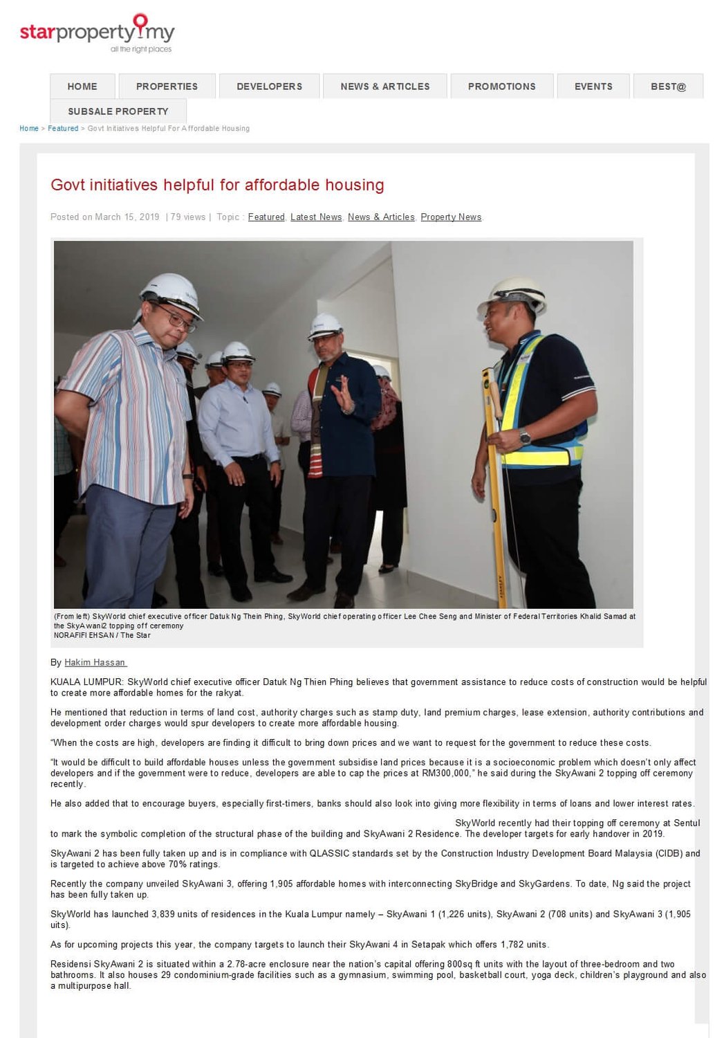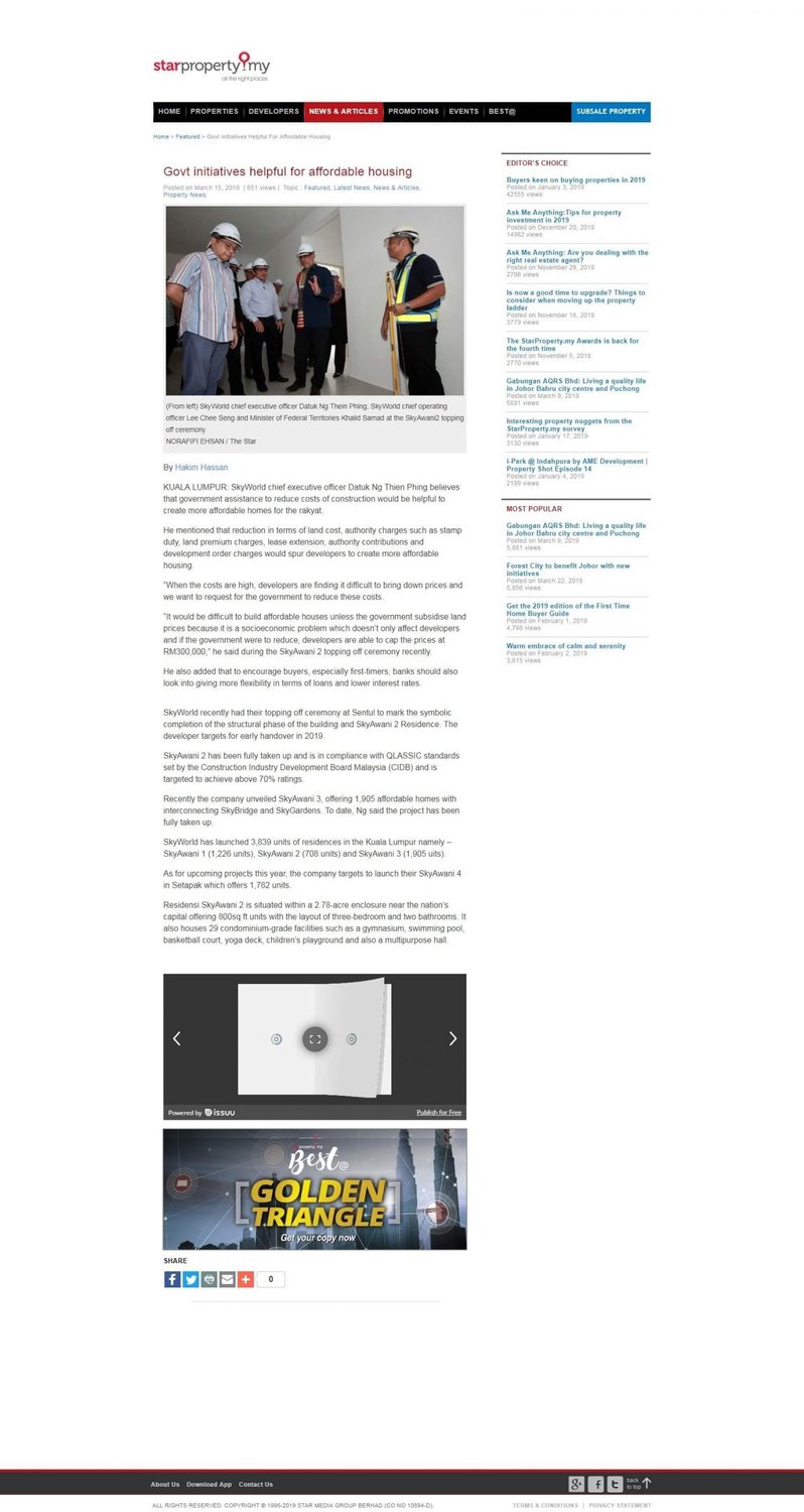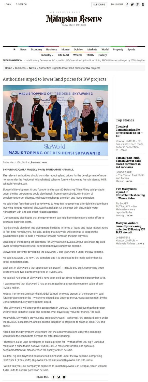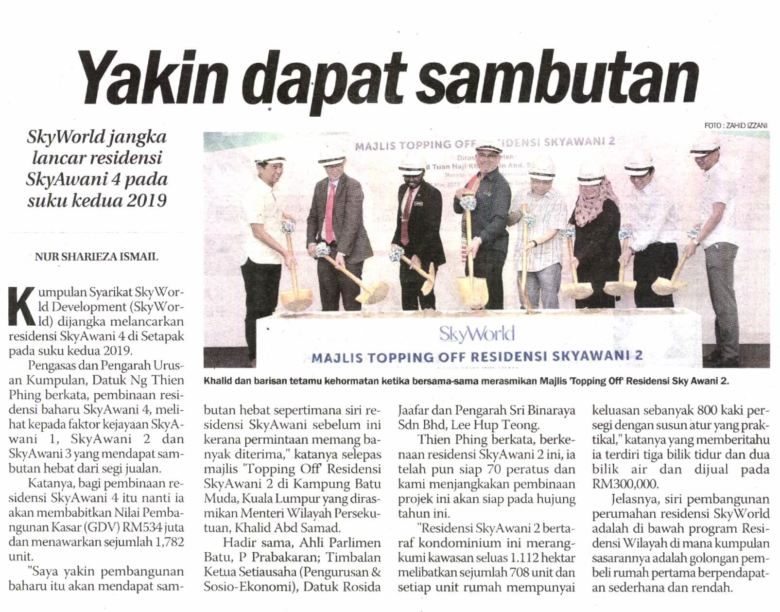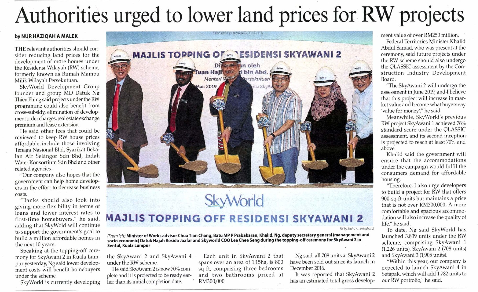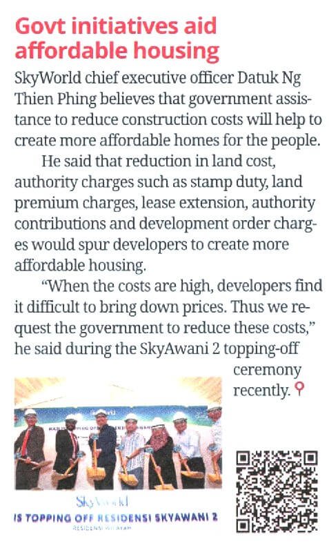 On 14 March 2019, SkyWorld celebrated another milestone today by hosting a successful SkyAwani 2 Topping Off ceremony at Sentul. The award-winning SkyAwani series has cemented its position as the must-owned starter homes for first-time home buyers – given its affordable price, practical layout and the icing on the cake; full-fledged condominium facilities. This Topping Off ceremony marks the symbolic completion of the structural phase of the building and SkyAwani 2 will be completed ahead of schedule. At the same time, SkyWorld also revealed that SkyAwani 2 Residences is in compliance with QLASSIC standards set by the Construction Industry Development Board Malaysia (“CIDB”) and is targeted to achieve above 70% QLASSIC rating.